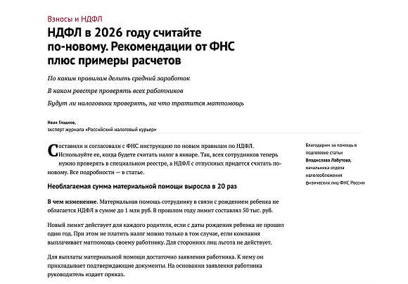 Около 30 лет редакция сотрудничает с ФНС, Минтрудом, Минфином и другими профильными ведомствами. Многолетние связи с чиновниками — позволяют получить актуальную информацию из первых рук для безошибочной сдачи отчетности и прохождению проверок без доначислений и штрафов